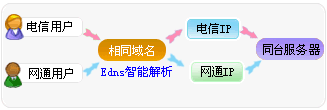 由于国内两大网络(电信和网通)之间的互联互通问题. 导致电信用户访问网通网站或网通用户访问电信网站很慢, 为解决这个问题, 先后有多种方案 A 给网站分别做电信站/网通站镜像:这种实际是用户分别在电信和网通租用托管1台服务器.两个服务器数据相同. 这样做成本高,并且维护非常不方便. 数据无法保持实时同步. B CDN(网站加速) : 这种方案是有一台服务器在电信/网通 缓存了 用户网站数据. 能够有一定的作用.但只对静态页面有效,对动态页面无效. C 双线主机.双线托管实际是一个机房有电信/网通 两条线路接入.通过机房内部路由器设置. 实现电信用户访问电信线路.网通用户访问网通线路. 这样实现电信网通均可以快速访问,. D 智能双线主机:智能双线主机是在双线服务上的进一步优化. 双线托管中效果最好的是双IP的托管方式.也就是一个服务器同时分配电信和网通各一个IP地址. 然后让电信用户访问电信IP地址.网通用户访问网通IP地址. 这种双线的效果最好. 但双IP托管中的难题 就是 如何实现.让电信用户自动访问电信IP地址.网通用户自动访问网通IP地址? 我们的EDNS 域名智能解析服务系统 就可以实现 域名的智能解析.用户可以配置好电信Ip地址和网通IP地址.例图如下:
